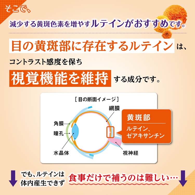 本品にはルテインが含まれます。ルテインには、目の黄斑色素量を増やし、ぼやけ・かすみを軽減して、くっきり物を見る力(コントラスト感度)を改善することが報告されています。
