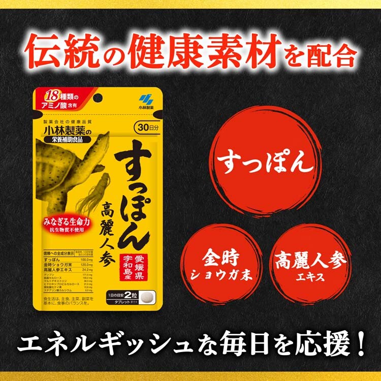 ●小林製薬の「すっぽん高麗人参」は、すっぽん、高麗人参(朝鮮人参)エキス、金時ショウガ末が配合されたエネルギッシュな毎日を応援するサプリです。