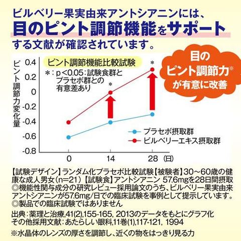 届出表示:本品にはビルベリー果実由来アントシアニンが含まれます。ビルベリー果実由来アントシアニンには、VDT作業(パソコンやスマートフォンなどのモニター作業)の目の疲れによるピント調節機能の低下を緩和することが報告されています。