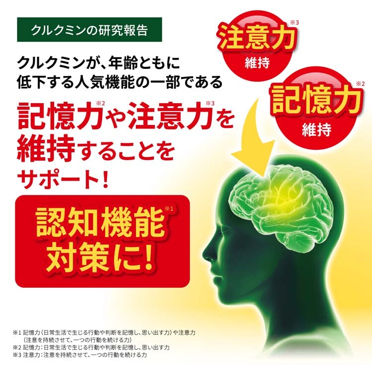 本品にはクルクミンが含まれます。クルクミンは、年齢とともに低下する認知機能の一部である記憶力(日常生活で生じる行動や判断を記憶し、思い出す力)や注意力(注意を持続させて、一つの行動を続ける力)を維持する機能があることが報告されています。