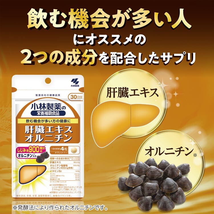 ●小林製薬「肝臓エキス オルニチン」は飲む機会が多い方にオススメな肝臓エキスとオルニチン2つの成分を配合。