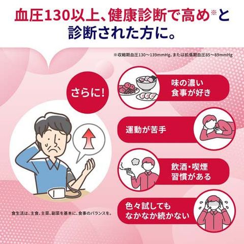 ●健康診断で血圧が高めと指摘された方(収縮期血圧130~139mmHg、または拡張期血圧85~89mmHg)。