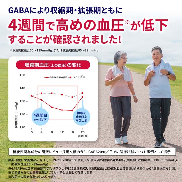 届出表示:本品にはγ-アミノ酪酸(GABA)が含まれます。γ-アミノ酪酸(GABA)には、血圧が高めの方の血圧を下げる機能が報告されています。