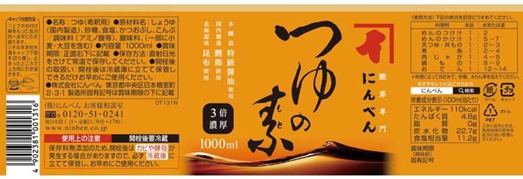 ●つゆに合うバランスの良い本醸造特級醤油を使い、かつお節の良さを100%引き出す製造方法で仕上げた、3倍濃厚つゆです。