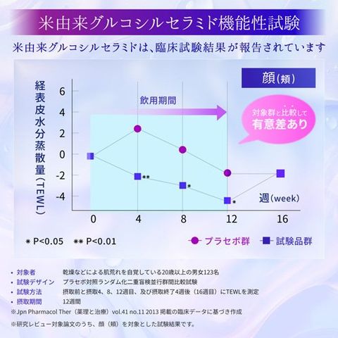 本品には米由来グルコシルセラミドが含まれます。米由来グルコシルセラミドは、肌のバリア機能(保湿力)を高めることが報告されています。肌の乾燥が気になる方に適した食品です。