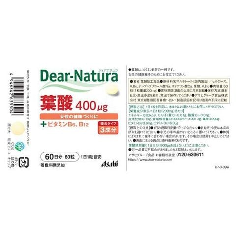 | 1日1粒(200mg)当たり エネルギー:0.83kcal、たんぱく質:0~0.01g、脂質:0~0.01g、炭水化物:0.19g、食塩相当量:0.000025~0.0013g、葉酸:400μg、ビタミンB6:3.0mg、ビタミンB12:6.0μg |