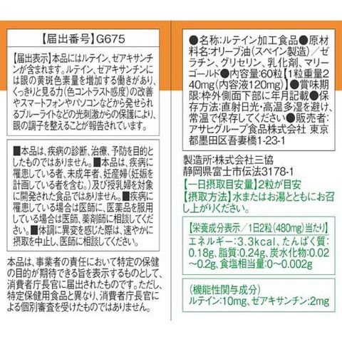 | 1日2粒(480mg)当たり エネルギー:3.3kcal、たんぱく質:0.18g、脂質:0.24g、炭水化物:0.02~0.2g、食塩相当量:0~0.002g (機能性関与成分) ルテイン:10mg、ゼアキサンチン:2mg |