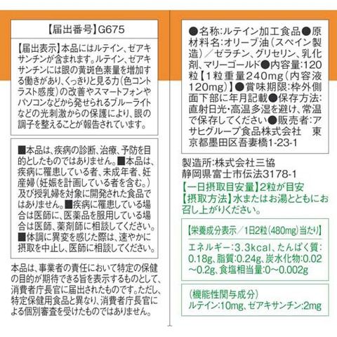 | 1日2粒(480mg)当たり エネルギー:3.3kcal、たんぱく質:0.18g、脂質:0.24g、炭水化物:0.02 -0.2g、食塩相当量 : 0-0.002g (機能性関与成分) ルテイン:10mg、ゼアキサンチン:2mg |