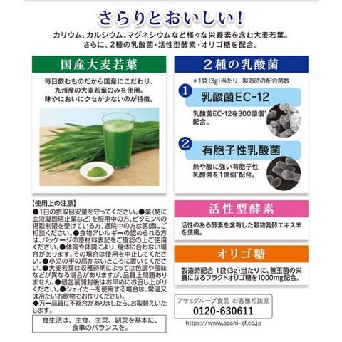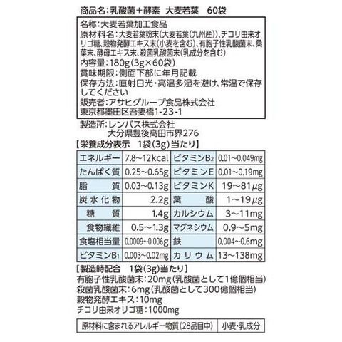 | 1袋(3g)あたり エネルギー:7.8~12kcal、たんぱく質:0.25~0.65g、脂質:0.03~0.13g、炭水化物:2.2g(糖質:1.4g、食物繊維:0.5~1.3g)、食塩相当量:0.0009~0.006g、ビタミンB1:0.003~0.02mg、ビタミンB2:0.01~0.049mg、ビタミンE:0.01~0.19mg、ビタミンK:19~81μg、葉酸:1~19μg、カルシウム:3~11mg、マグネシウム:0.9~5mg、鉄:0.004~0.6mg、カリウム:13~138mg 製造時配合 殺菌乳酸菌末:6mg(乳酸菌として300億個相当)、穀物発酵エキス:10mg、チコリ由来オリゴ糖:1000mg |