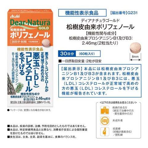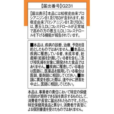 届出表示:本品には松樹皮由来プロシアニジンB1及びB3が含まれます。松樹皮由来プロシアニジンB1及びB3には、悪玉(LDL)コレステロールが正常域で高めの方の悪玉(LDL)コレステロールを下げる機能が報告されています。