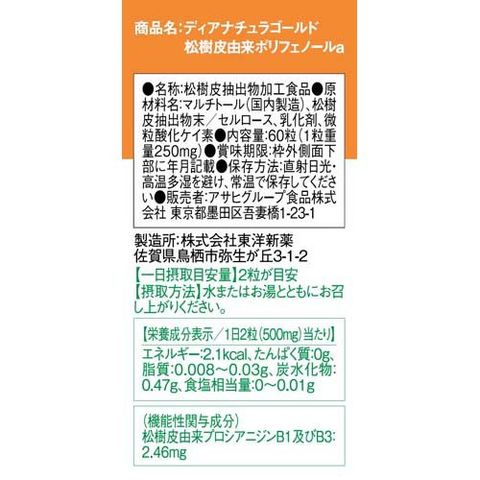 | 1日2粒(500mg)当たり エネルギー:2.1kcal、たんぱく質:0g、脂質:0.008~0.03g、炭水化物: 0.47g、食塩相当量: 0~0.01g (機能性関与成分)松樹皮由来プロシアニジンB1及びB3:2.46mg |