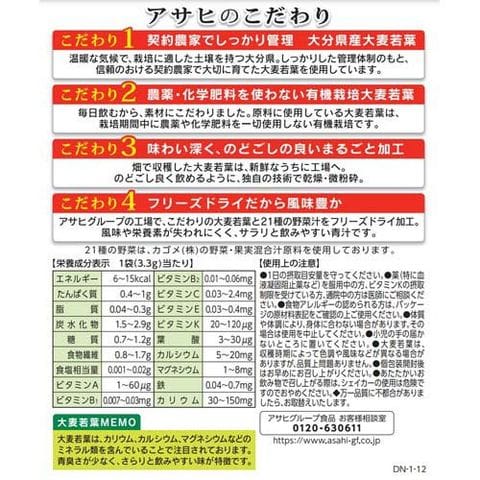 アサヒグループの工場で、こだわりの大麦若葉と21種の野菜汁をフリーズドライ加工。 風味や栄養素が失われにくく、サラリと飲みやすい青汁です。