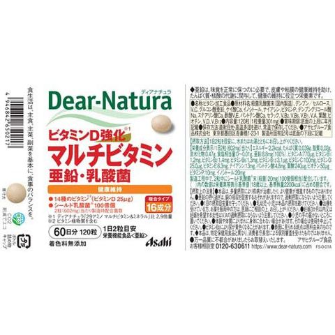 | 殺菌乳酸菌末(国内製造)、デンプン/セルロース、V.C、グルコン酸亜鉛、ケイ酸Ca、イノシトール、ナイアシン、ビタミンP、デンプングリコール酸Na、ステアリン酸Ca、酢酸V.E、パントテン酸Ca、セラック、V.B2、V.B6、V.B1、V.A、葉酸、ビオチン、V.D、V.B12 |