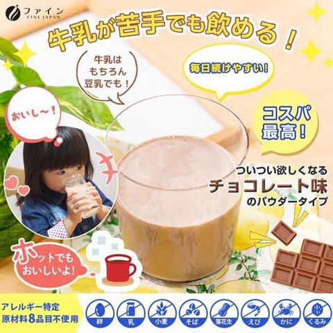 ●牛乳が嫌いなお子様でも飲みやすく、乳アレルギーの場合には豆乳等でおいしくカルシウム摂取ができるように仕上げました。