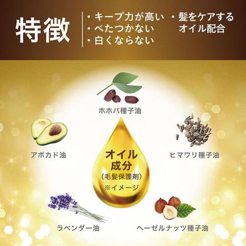 | エタノール、LPG、(アクリレーツ/アクリル酸アルキル(C1-18)/アルキル(C1-8)アクリルアミド)コポリマーAMP、ホホバ種子油、アボカド油、ヘーゼルナッツ種子油、ラベンダー油、ラノリン脂肪酸オクチルドデシル、PVP、PPG-9ジグリセリル、ポリシリコーン-13、ステアラミドプロピルジメチルアミン、BHT、酢酸リナリル |