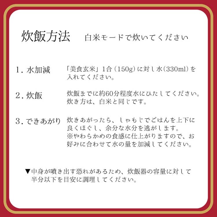 ・玄米を使用している為、米粒の形や色に不揃いが生じますが「美食玄米」の食味に影響を及ぼすものではありません。※緑色の粒は、葉緑素が沈着しているものです。