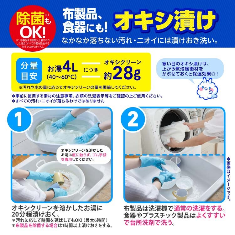 ・本品をお湯に溶かし(衣類の場合は、洗濯表示に表記されている最高温度で使用してください)、溶液に1‐6時間ほど漬けおきします。その後、衣類は通常通り洗濯してください(汚れがひどい場合は「お洗濯の場合」の方法で洗濯してください)。