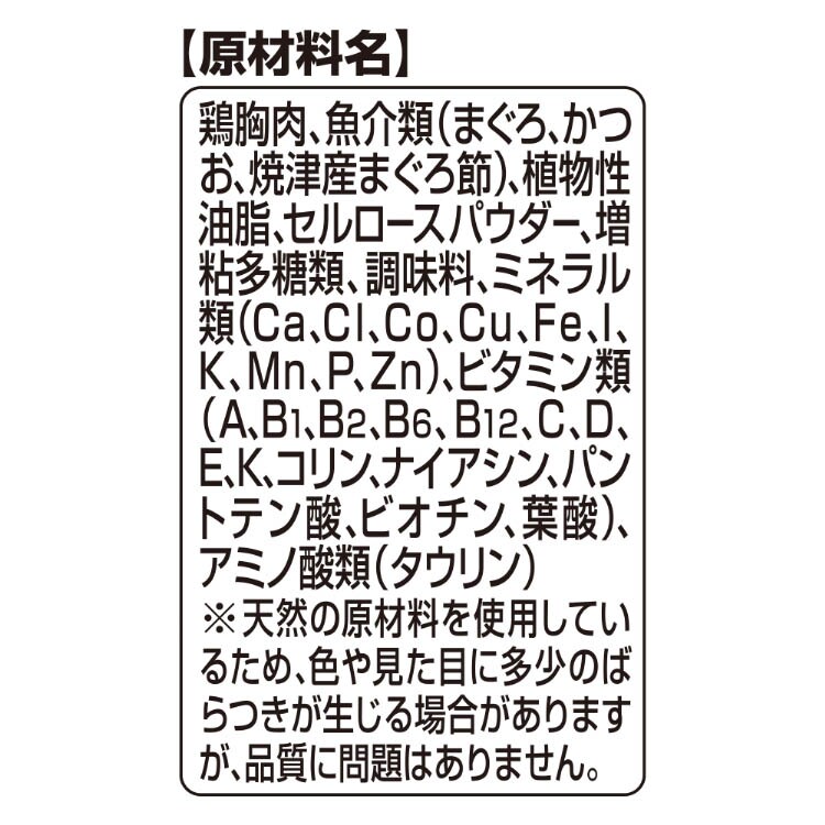| 鶏胸肉、魚介類(まぐろ、かつお、焼津産まぐろ節)、植物性油脂、セルロースパウダー、増粘多糖類、調味料、ミネラル類(Ca、Cl、Co、Cu、Fe、I、K、Mn、P、Zn)、ビタミン類(A、B1、B2、B6、B12、C、D、E、K、コリン、ナイアシン、パントテン酸、ビオチン、葉酸)、アミノ酸(タウリン)※天然の原材料を使用しているため、色や見た目に多少のばらつきが生じる場合がありますが、品質に問題はありません。 |