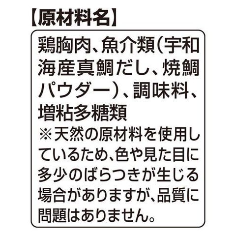 | 鶏胸肉、魚介類(宇和海産真鯛だし、焼鯛パウダー)、調味料、増粘多糖類※天然の原材料を使用しているため、色や見た目に多少のばらつきが生じる場合がありますが、品質に問題はありません。 |
