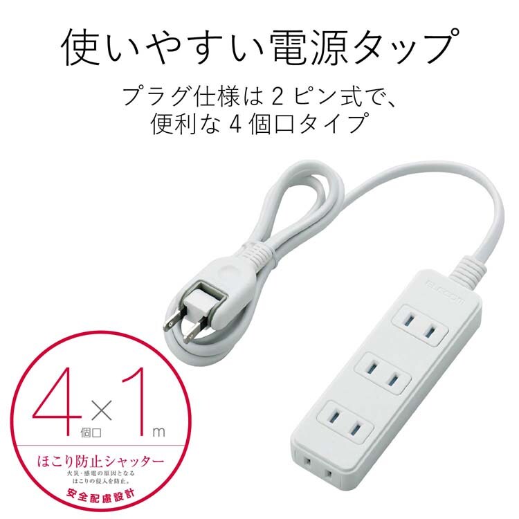 【エレコム 延長コード 電源タップ 1m 2P 4個口 ホコリ防止シャッター T-TST02-22410WHの商品詳細】