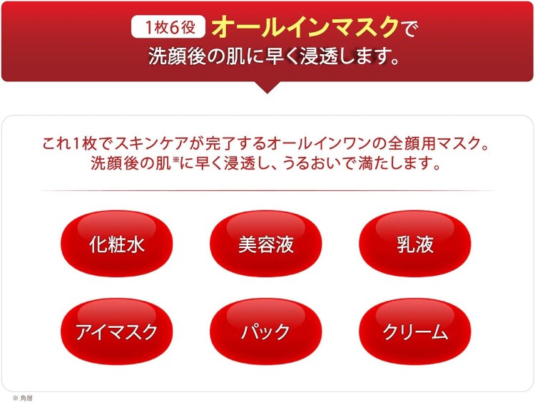 ●化粧水+美容液+乳液+クリーム+パック+アイマスクの効果を1枚で。
