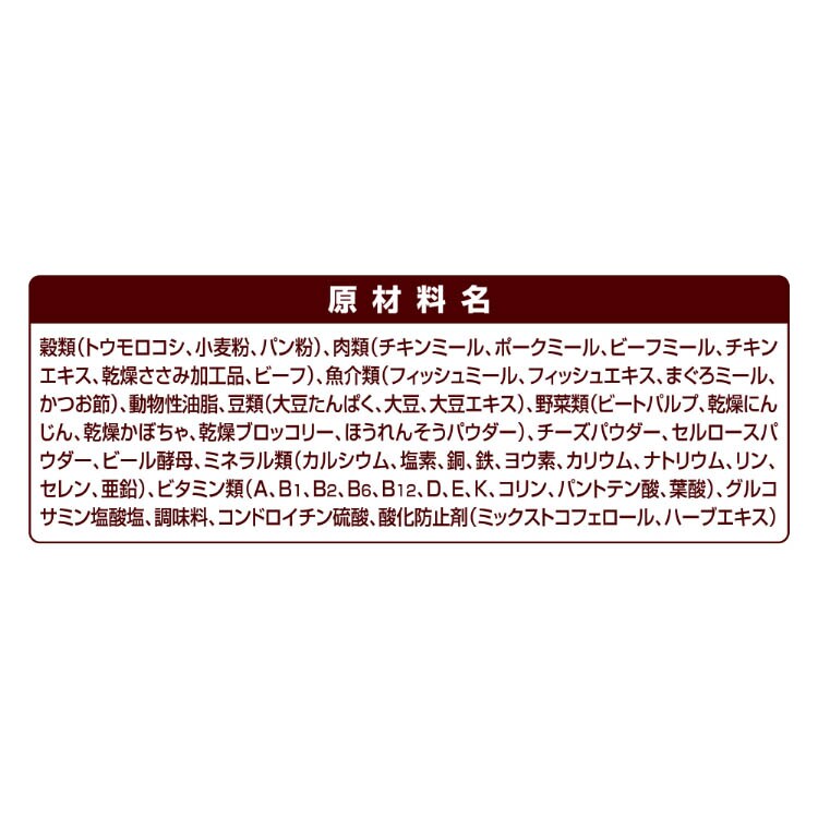 穀類(トウモロコシ、小麦粉、パン粉)、肉類(チキンミール、ポークミール、ビーフミール、チキンエキス、乾燥ささみ加工品、ビーフ)、魚介類(フィッシュミール、フィッシュエキス、まぐろミール、かつお節)、動物性油脂、豆類(大豆たんぱく、大豆、大豆エキス)、野菜類(ビートパルプ、乾燥にんじん、乾燥かぼちゃ、乾燥ブロッコリー、ほうれんそうパウダー)、チーズパウダー、セルロースパウダー、ビール酵母、ミネラル類(カルシウム、塩素、銅、鉄、ヨウ素、カリウム、ナトリウム、リン、セレン、亜鉛)、ビタミン類(A、B1、B2、B6、B12、D、E、K、コリン、パントテン酸、葉酸)、グルコサミン塩酸塩、調味料、コンドロイチン硫酸、酸化防止剤(ミックストコフェロール、ハーブエキス)