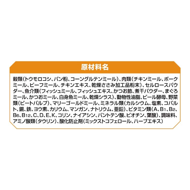 | 穀類(トウモロコシ、パン粉、コーングルテンミール)、肉類(チキンミール、ポークミール、ビーフミール、チキンエキス、乾燥ささみ加工品粉末)、セルロースパウダー、魚介類(フィッシュミール、フィッシュエキス、かつお節、煮干パウダー、まぐろミール、かつおミール、白身魚ミール、乾燥シラス)、動物性油脂、ビール酵母、野菜類(ビートパルプ)、マリーゴールドミール、ミネラル類(カルシウム、塩素、コバルト、銅、鉄、ヨウ素、カリウム、マンガン、ナトリウム、亜鉛)、ビタミン類(A、B1、B2、B6、B12、C、D、E、K、コリン、ナイアシン、パントテン酸、ビオチン、葉酸)、調味料、アミノ酸類(タウリン)、酸化防止剤(ミックストコフェロール、ハーブエキス) |