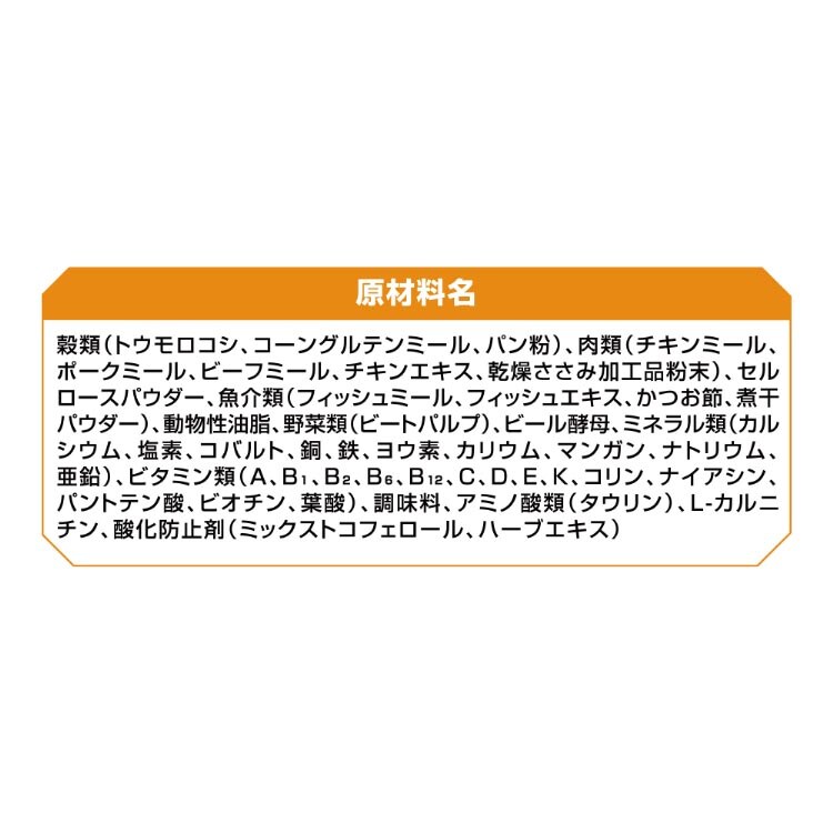 穀類(トウモロコシ、コーングルテンミール、パン粉)、肉類(チキンミール、ポークミール、ビーフミール、チキンエキス、乾燥ささみ加工品粉末)、セルロースパウダー、魚介類(フィッシュミール、フィッシュエキス、かつお節、煮干パウダー)、動物性油脂、野菜類(ビートパルプ)、ビール酵母、ミネラル類(カルシウム、塩素、コバルト、銅、鉄、ヨウ素、カリウム、マンガン、ナトリウム、亜鉛)、ビタミン類(A、B1、B2、B6、B12、C、D、E、K、コリン、ナイアシン、パントテン酸、ビオチン、葉酸)、調味料、アミノ酸類(タウリン)、L-カルニチン、酸化防止剤(ミックストコフェロール、ハーブエキス)