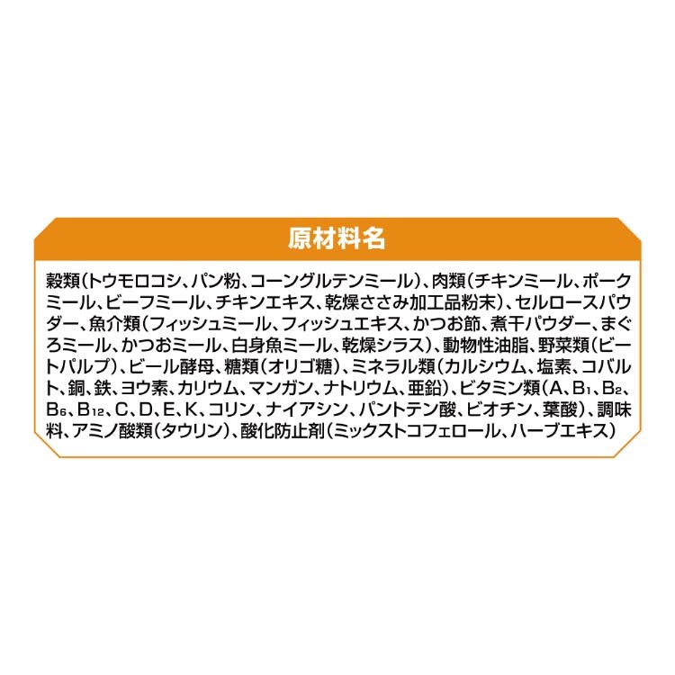 穀類(トウモロコシ、パン粉、コーングルテンミール)、肉類(チキンミール、ポークミール、ビーフミール、チキンエキス、乾燥ささみ加工品粉末)、セルロースパウダー、魚介類(フィッシュミール、フィッシュエキス、かつお節、煮干パウダー、まぐろミール、かつおミール、白身魚ミール、乾燥シラス)、動物性油脂、野菜類(ビートパルプ)、ビール酵母、糖類(オリゴ糖)、ミネラル類(カルシウム、塩素、コバルト、銅、鉄、ヨウ素、カリウム、マンガン、ナトリウム、亜鉛)、ビタミン類(A、B1、B2、B6、B12、C、D、E、K、コリン、ナイアシン、パントテン酸、ビオチン、葉酸)、調味料、アミノ酸類(タウリン)、酸化防止剤(ミックストコフェロール、ハーブエキス)
