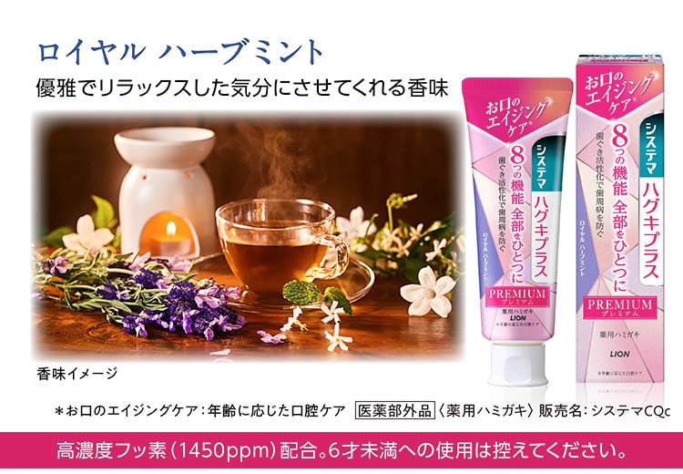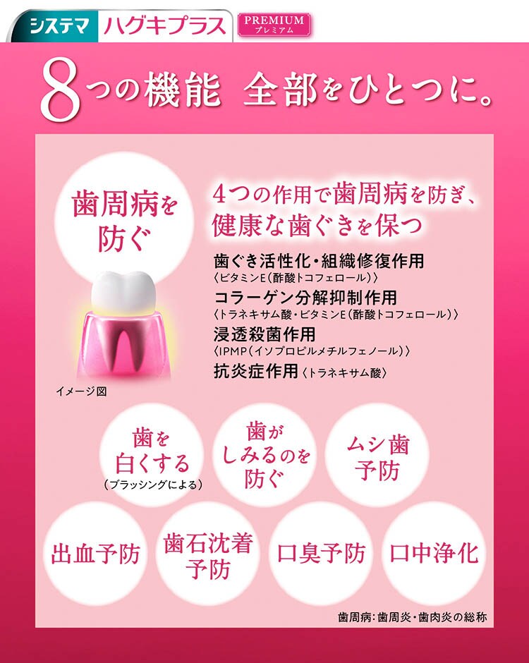 (歯ぐき活性化し歯周病を防ぐと共に、8つの機能全部がひとつになったプレミアム処方の薬用ハミガキ)