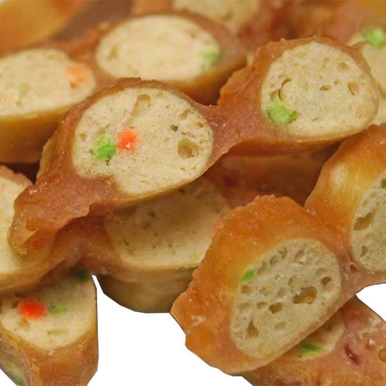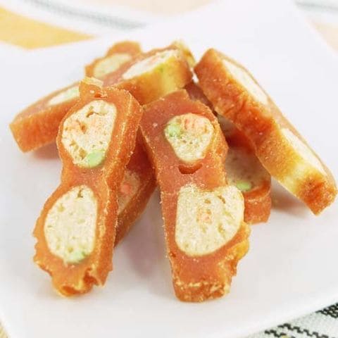| 鶏肉(ササミ、胸肉)、小麦粉、でん粉類、野菜(にんじん、ほうれん草)、魚軟骨、ミネラル類(カルシウム、ナトリウム)、ソルビトール、グリセリン、プロピレングリコール、膨張剤、リン酸塩(Na)、酸化防止剤(ビタミンE)、発色剤(亜硝酸ナトリウム)、着色料(赤102、赤106、黄4、青1) |