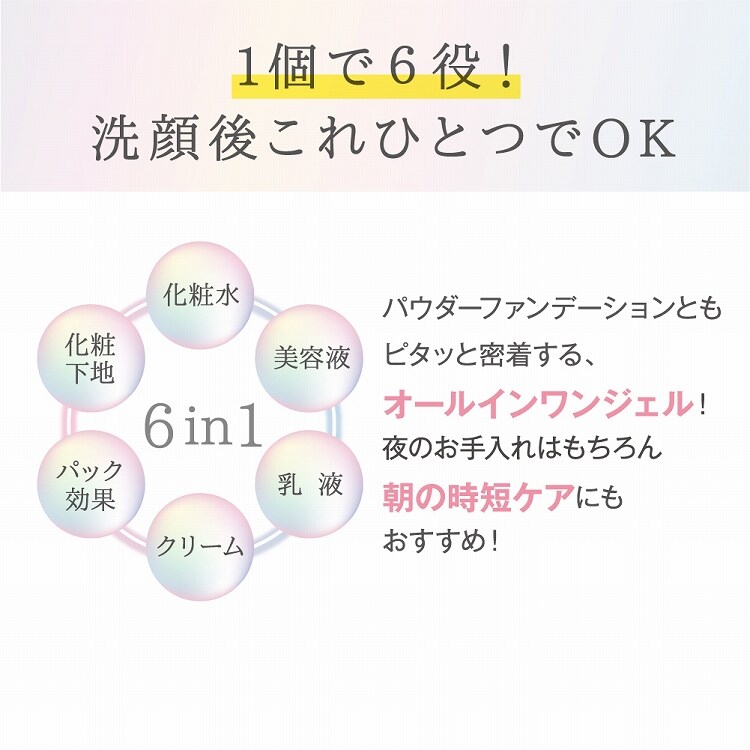 ●化粧水・美容液・乳液・クリーム・パック効果・化粧下地の1個で6役!