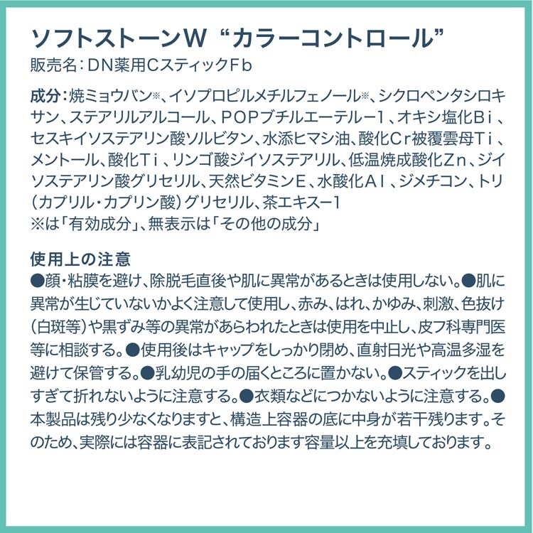 | 有効成分:焼ミョウバン、イソプロピルメチルフェノール その他成分:シクロペンタシロキサン、ステアリルアルコール、POPブチルエーテル-1、オキシ塩化Bi、セスキイソステアリン酸ソルビタン、水添ヒマシ油、酸化Cr被覆雲母Ti、メントール、酸化Ti、リンゴ酸ジイソステアリル、低温焼成酸化Zn、ジイソステアリン酸グリセリル、天然ビタミンE、水酸化AI、ジメチコン、トリ(カプリル・カプリン酸)グリセリル、茶エキス-1 |