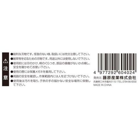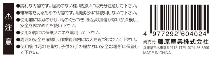 ・鋭利な刃物です。怪我のない様、取扱いには充分注意して下さい。・雑草等を切るための刃物です。用途以外には使用しないで下さい。・使用前には刃のかけ、柄のぐらつき、部品の損傷がないか点検し、安全を確かめてお使い下さい。・使用の際には保護めがね・手袋などを着用してください。・使用後は汚れを取り、子供の手の届かない安全な場所に保管してください。