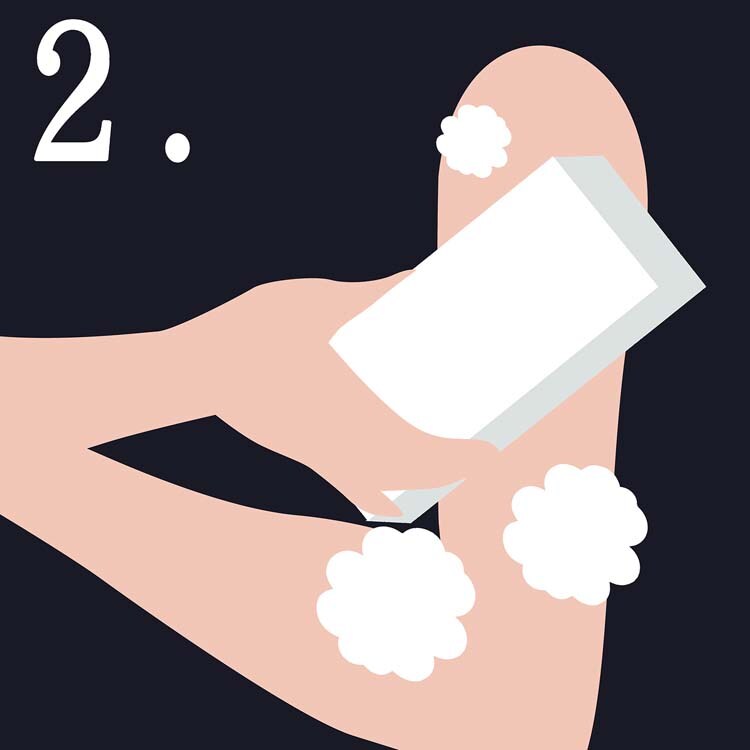 (2)二の腕を石けんの広い面で、円を描くように優しくなでます。