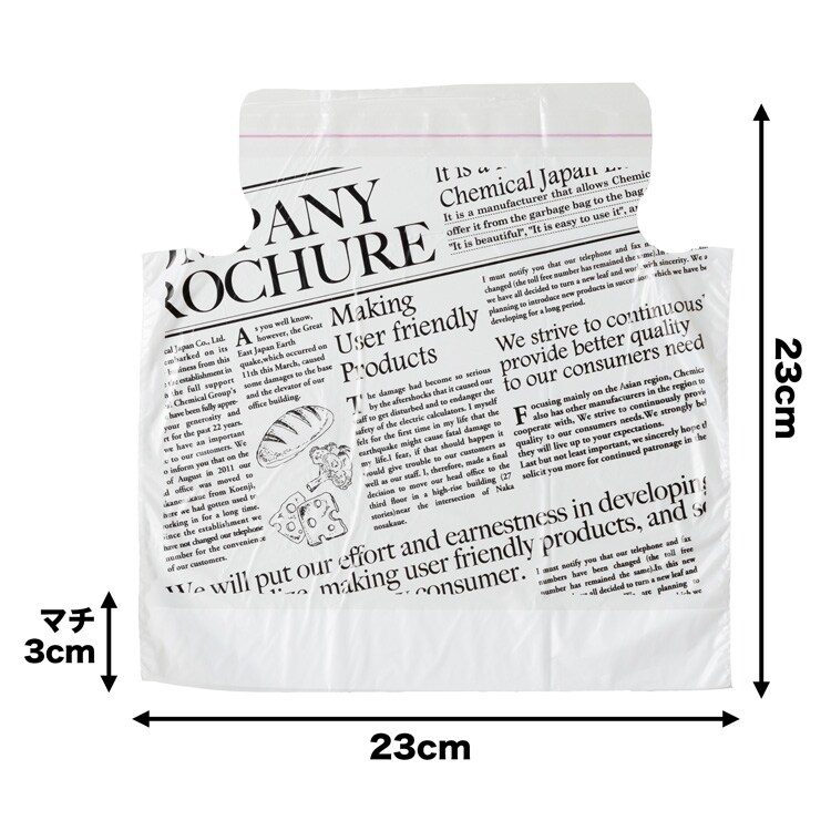 本体サイズ:タテ230*ヨコ260(230+30)mm、厚さ0.013mm