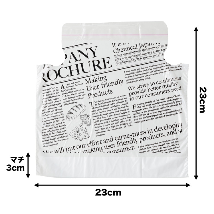 | 本体材質:ポリエチレン 本体サイズ:タテ230*ヨコ260(230+30)mm、厚さ0.013mm 耐冷温度:マイナス30度 |