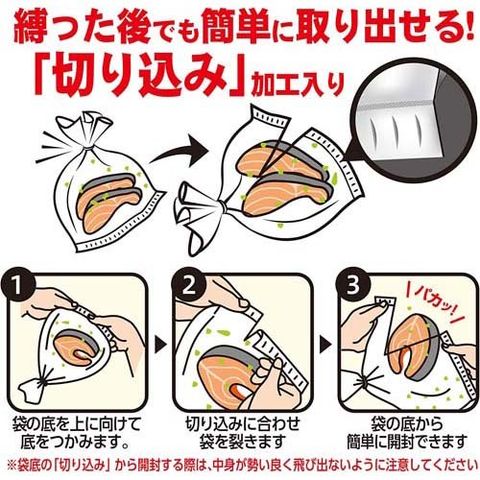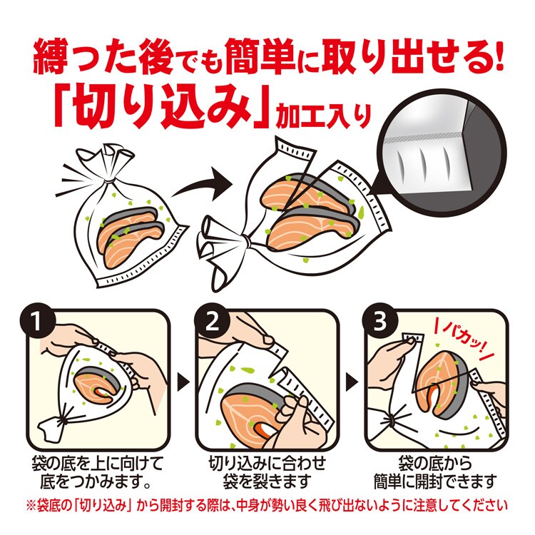 ●袋の底に切り込みが入った調理ポリ袋、きつく結んでも袋の底から簡単に開封できます。