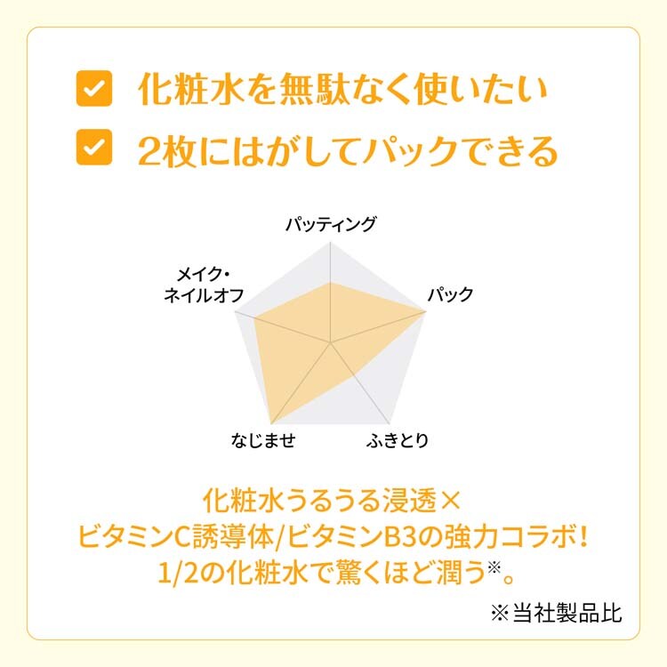 ●1/2の化粧水で驚くほど潤い、パックまでできる機能はそのままに、ビタミンC誘導体、ビタミンB3を配合。