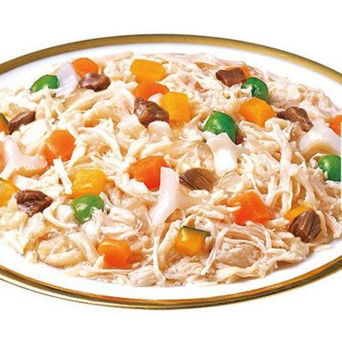 鶏肉(ささみ)、野菜類(人参、かぼちゃ、グリンピース)、鶏軟骨、牛肉、大豆油、でん粉類、寒天、ミネラル類(Ca、Fe、Cu、Mn、Zn、I、K、P、Mg、Se)、増粘多糖類、ビタミン類(A、D3、E、B1、B2、B6、葉酸、B12、コリン、ビオチン)、紅麹色素、緑茶エキス