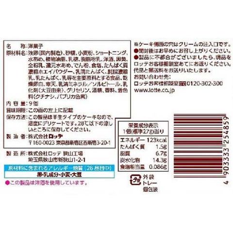 | 液卵(国内製造)、砂糖、小麦粉、ショートニング、水あめ、植物油脂、乳糖、脱脂粉乳、洋酒、卵黄、全粉乳、還元水あめ、でん粉、食塩、たんぱく質濃縮ホエイパウダー、乳清たんぱく、脱脂濃縮乳、乳たんぱく、乳等を主要原料とする食品、乾燥卵白、寒天、乳清ミネラル/ソルビトール、乳化剤(大豆由来)、グリセリン、酒精、香料、着色料(クチナシ、パプリカ色素) |