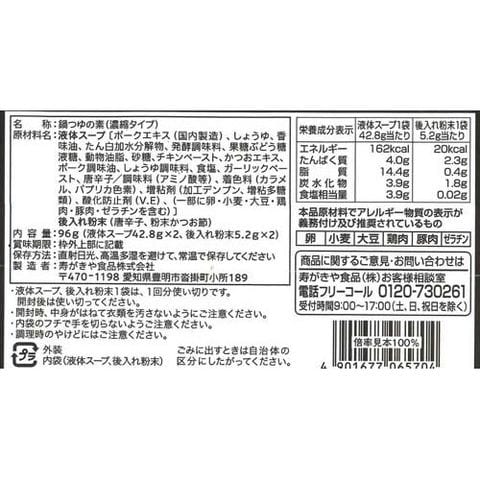 | 液体スープ1袋 42.8g当たりエネルギー:162kcal、たん白質:4.0g、脂質14.4g、炭水化物:3.9g、食塩相当量:3.9g 後入れ粉末1袋5.2g当たりエネルギー:20kcal、たん白質:2.3g、脂質:0.4g、炭水化物:1.8g、食塩相当量:0.02g |