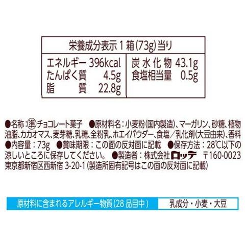 小麦粉(国内製造)、マーガリン、砂糖、植物油脂、カカオマス、麦芽糖、乳糖、全粉乳、ホエイパウダー、食塩/乳化剤(大豆由来)、香料