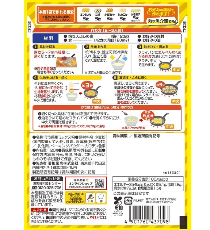 ●お好きな具材を切って、生地をつけて約6分間(目安)焼くだけで、ザクザク食感の天ぷらが食べられます。
