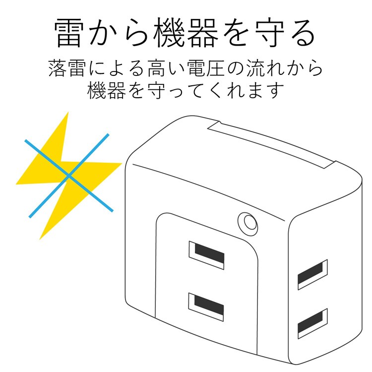●最大サージ電圧2500Vの高性能雷サージ吸収素子(バリスタ)を内蔵していますので、雷によるパソコンやAV機器などの電子機器への被害防止に有効です。(最大サージ電圧2500VはIEC61000-4-5規格に基づく数値です。