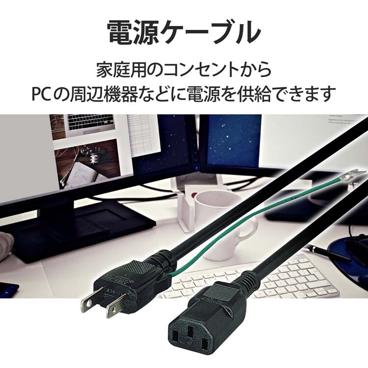 パソコン、周辺機器等と家庭用コンセントを接続する電源ケーブルです。