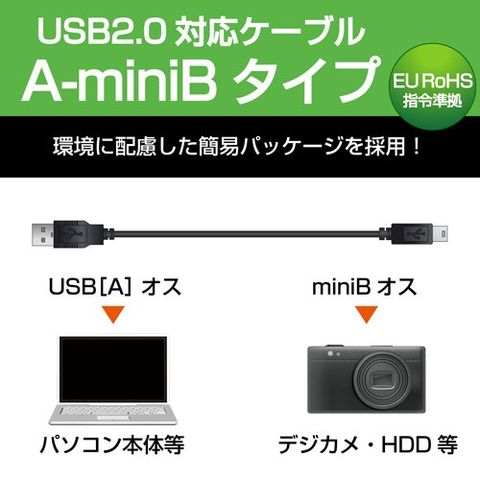 ●EU RoHS指令準拠(10物質)、環境配慮パッケージで、環境にやさしいエコケーブル!パソコンやゲーム機に、USB(mini-Bタイプ)のインターフェイスを持つ外付けハードディスクドライブやデジタルカメラ、ポータブルゲーム機などの周辺機器を接続できる、A-mini-BタイプのUSB2.0準拠ケーブル。