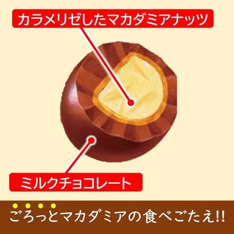 砂糖(国内製造)、キャンディコートマカダミアナッツ(マカダミアナッツ、砂糖、水あめ、植物油脂)、全粉乳、ココアバター、カカオマス、植物油脂、乳糖、水あめ/乳化剤、光沢剤、香料、増粘剤(アラビアガム)、(一部に乳成分・アーモンド・大豆を含む)