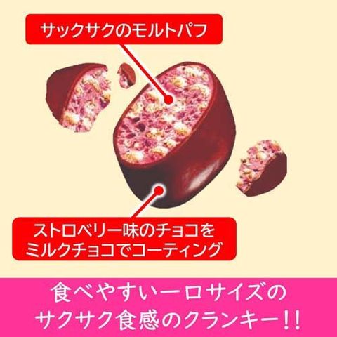 ●クランキーの最大のこだわりであるサクサク食感のモルトパフを、フルーティーな苺をイメージしたチョコレートにギッシリ配合しました。