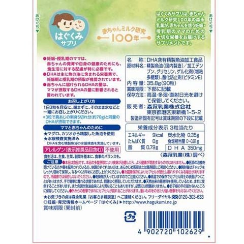 | 3粒当たり エネルギー:9kcal、たんぱく質:0g、脂質:0.79g、炭水化物:0.35g、食塩相当量:0~0.01g、DHA:350mg |